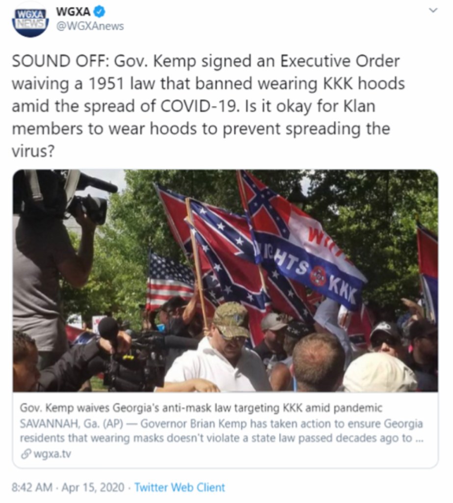 Last week in Georgia, State Senator and Democratic Party Leader Nikema Williams urged Governor Brian Kemp (R) to take action against a 1950s anti-mask law aimed at the KKK. She and others feared the law would be used to racially profile people of color wearing masks in public to protect themselves against COVID-19. Kemp did so, suspending the law. Here’s how a local news organization chose to cover the story: