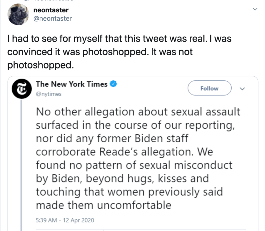The Times published another article, an interview with executive editor, Dean Baquet, explaining why they waited so long to report on Reade’s allegations. When asked why they deleted that sentence, Baquet said, “I think that the campaign thought that the phrasing was awkward and made it look like there were other instances in which he had been accused of sexual misconduct. And that’s not what the sentence was intended to say.”