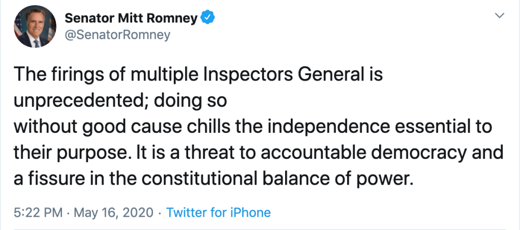 After Watergate, Congress created the role of Inspectors General as independent watchdogs, installed in federal agencies to root out corruption, waste, and lawbreaking. In the past twenty years, just one president, Barack Obama, has fired an Inspector General. He received bipartisan criticism for it, and never did it again. Donald Trump has fired five Inspectors General in six weeks. He usually does it on Friday nights, a favorite move of politicians who want to avoid media coverage. And he is replacing the fired Inspectors with loyal political allies, some of whom still hold their jobs within the agencies they are supposed to be investigating. It has been too much even for Senator Chuck Grassley (R), who wrote a letter to the President reminding him that he is required to give Congress 30 days notice before removing an IG (he didn’t) and that “Inspectors General are not removed for political reasons.” Mitt Romney was more direct: