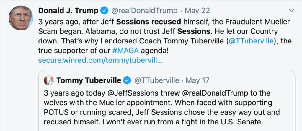 Jeff Sessions (R, Alabama) was the first Senator to endorse Candidate Trump. Trump made him Attorney General. Sessions recused himself from the Russia investigation after bipartisan Congressional demand that he do so. Trump has never forgiven him for this perceived betrayal, and now that Sessions is again running for an Alabama Senate seat, the president is chucking him directly under the bus.