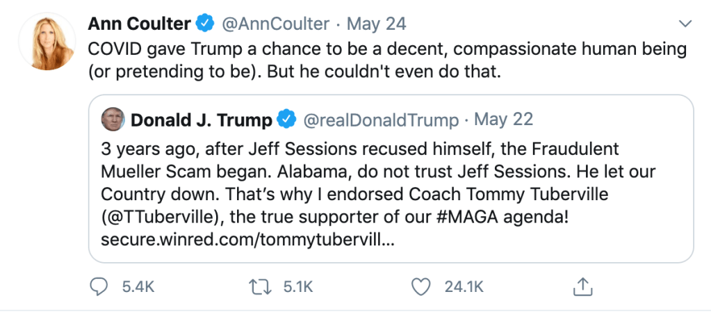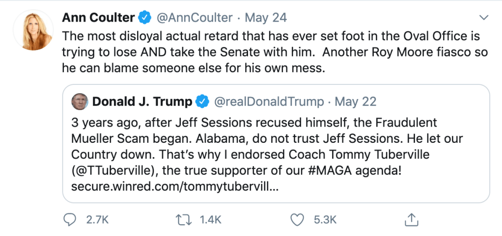 There’s more, if you care to see it. But the greatest part of this kerfluffle was the reaction from Ann Coulter, the right wing immigration hawk who was an early and outspoken supporter of Candidate Trump, and who literally wrote a book called “In Trump We Trust.”