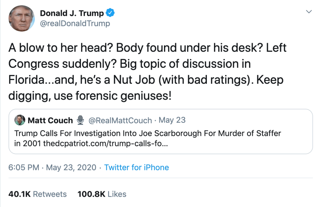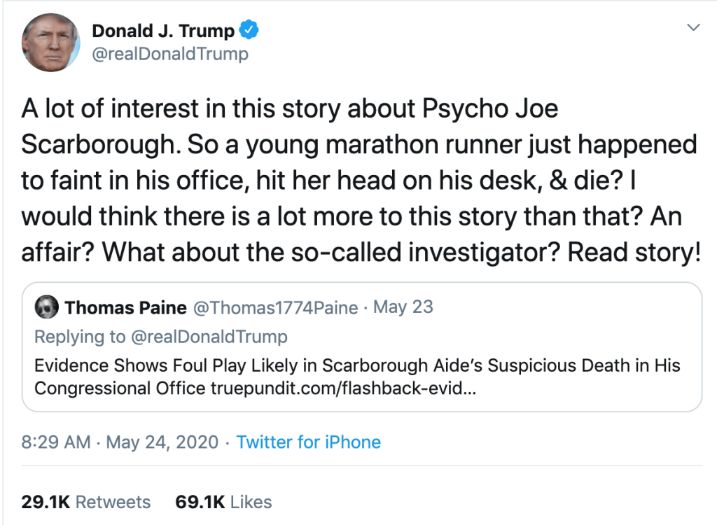 Joe Scarborough, former Republican member of Congress and current co-host of Morning Joe on MSNBC, has been critical of Donald Trump, and their public catfights are nothing new. But now Trump has taken their feud to a level almost too demented to be believed. He has now repeatedly tweeted a debunked conspiracy theory accusing Scarborough of having an affair with and then murdering his aide, Lori Klausutis. She was only 28 when she died in 2001 of an undiagnosed heart condition, but the president urged his 80 million Twitter followers to “Read story!”