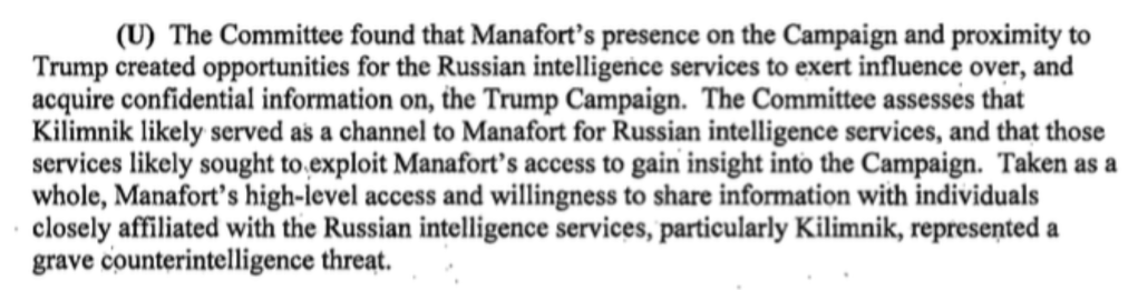 “Kilimnik is a Russian intelligence officer.” Kilimnik, mentioned over 800 times in the report, was also mentioned in the Mueller report as having ties to Russian intelligence. The Senate report goes further than Muller did, making clear Kilimnik was himself a Russian agent. And Trump’s campaign chair was secretly in frequent communication with him, sharing confidential information with him.