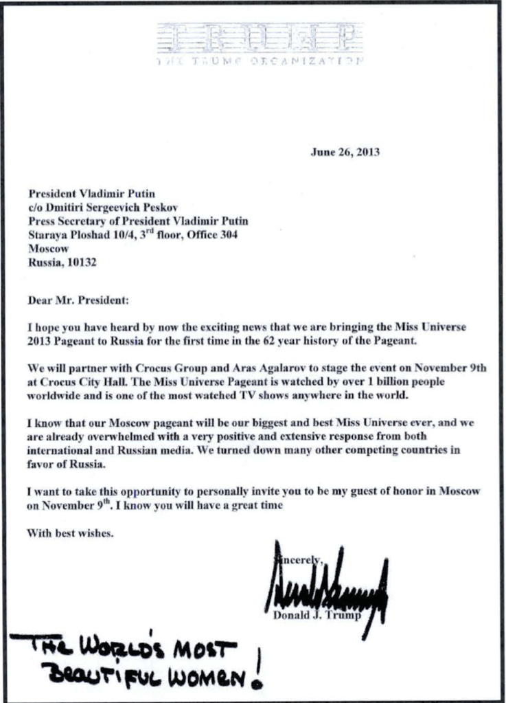 A few years later, in 2013, Trump wondered via tweet whether Vladimir would be attending the Miss Universe Pageant in Moscow, and whether Putin would “become my new best friend?” Eight days later, he sent another letter, inviting Putin to be his “guest of honor” at the pageant. He handwrote a note in black marker at the bottom: “THE WORLD’S MOST BEAUTIFUL WOMEN!”