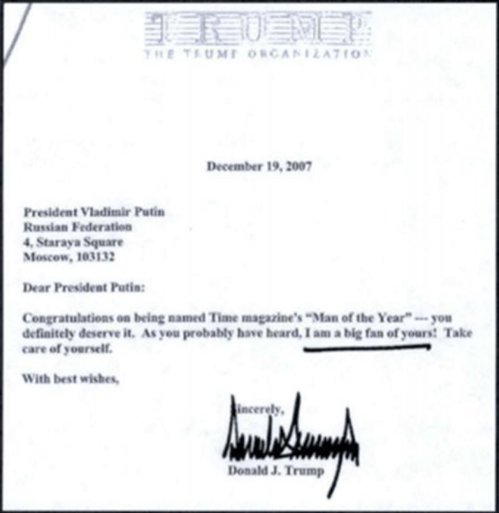 In 2007, private citizen Trump wrote a congratulatory letter to Putin after he was named TIME magazine’s “Person of the Year.” Trump wrote, “…you definitely deserve it,” followed by, “I am a big fan of yours!” underlined in black marker.