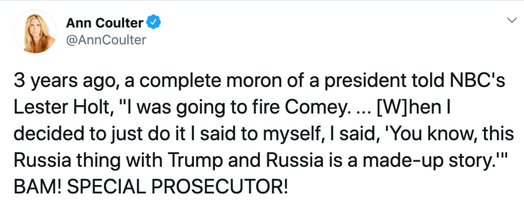 Concern in the intelligence community mounted, fueled partially by the now-infamous Steele Dossier, put together by a former British intelligence agent. The president fired FBI director James Comey, and Congress appointed a special prosecutor to look into the allegations. Trump insisted the whole thing was a witch hunt, and some Republicans claimed the Mueller investigation was illegal. I’ll leave it to Ann Coulter, one of candidate Trump’s earliest and biggest supporters, to contradict them: