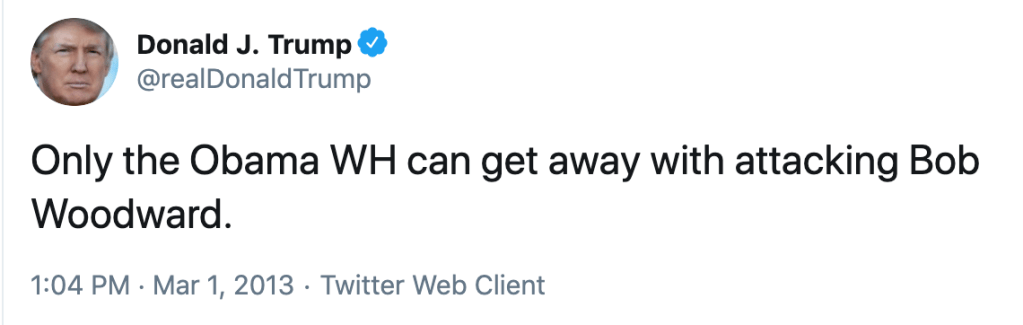 Naturally, Trump has lashed out at the man he gave those eighteen interviews to, accusing him of a “political hit job,” calling his book “boring,” and referring to him as “rapidly fading Bob Woodward.” But the president is forgetting one of the natural laws of Trumpian physics: there is always a tweet.