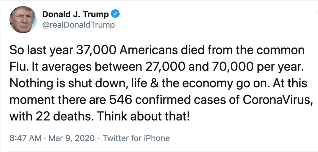 Feb 27: At a press conference, Trump says of COVID, “View this the same as the flu…Treat this like you treat the flu, and it’s gonna be fine.”