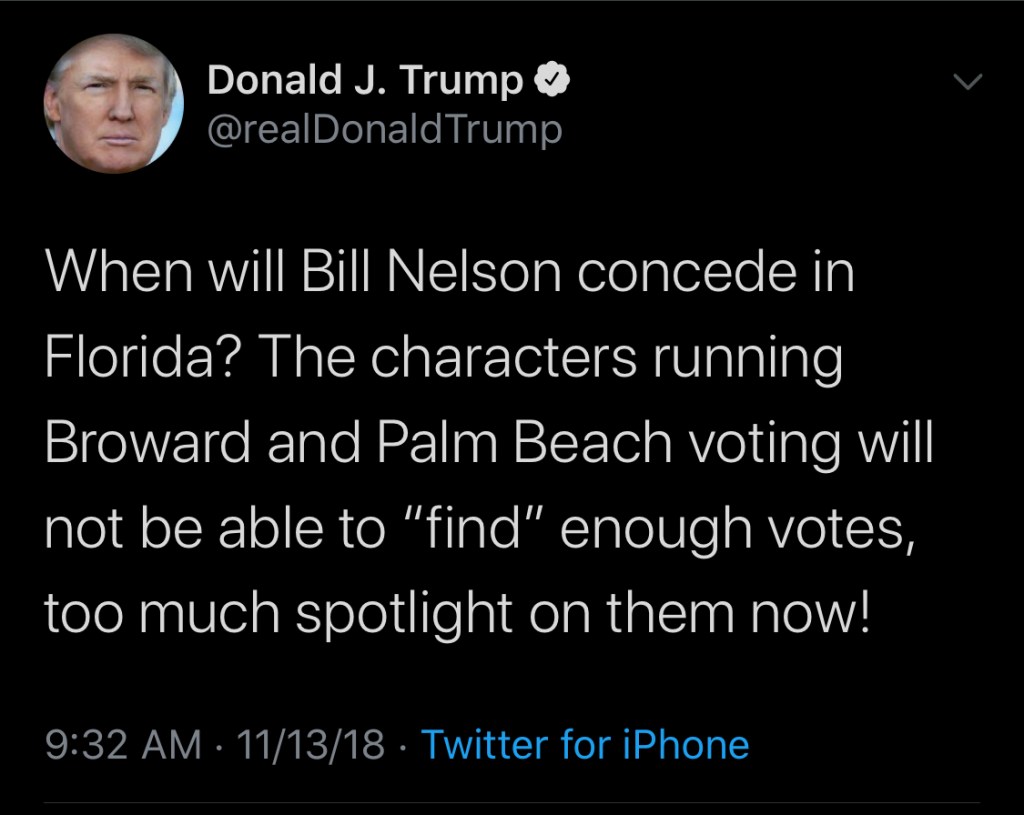 During the 2018 senate race recount between Democrat Bill Nelson and Republican Tim Scott, he taunted Nelson, telling him to concede before the recount was finished, and implying election officials were dirty. (The recount saw an increase in votes for Nelson, but not enough for him to win the election.)