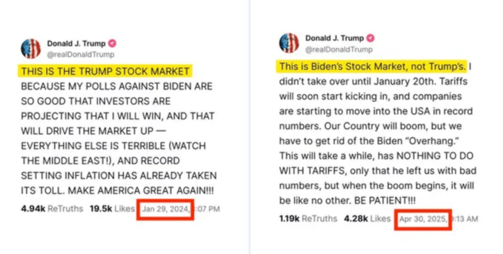 So, the economy that was booming under Biden was actually Trump’s doing, and the economy that has been crippled in the first 100 days of Trump’s administration by his unprecedented single-handed manipulation of global trade is actually Biden’s doing. Got it.
