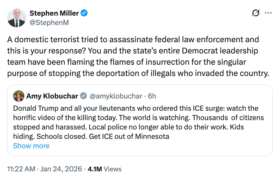 Here we have one of at least three tweets in which the Deputy Chief of Staff for policy—and the architect of Trump’s immigration policy—calls Alex Pretti a domestic terrorist and/or assassin, and says he tried to murder federal agents.