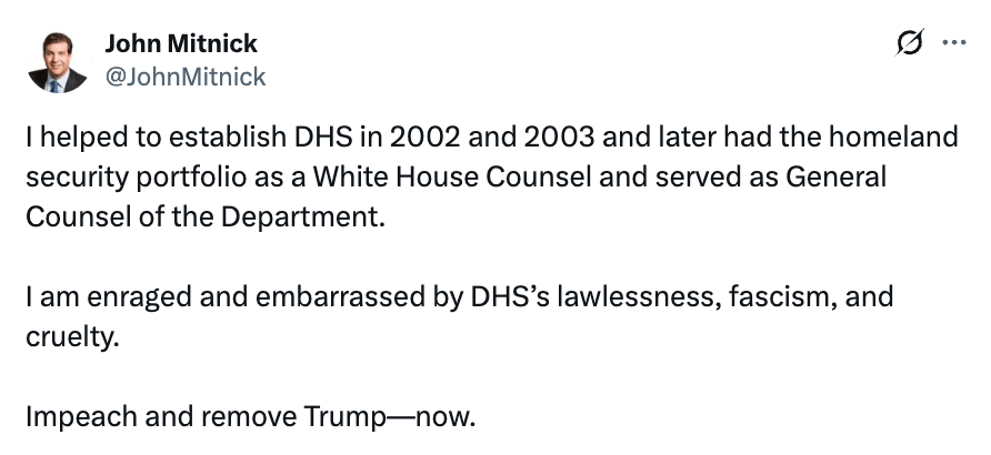 John Mitnick is a conservative attorney who served in the White House Counsel’s office under George W. Bush, General Counsel for DHS under Trump 1.0 (he was nominated by Trump for the position), and also worked for the conservative Heritage Foundation. He helped create the brand-new agency of DHS in the early 2000s.