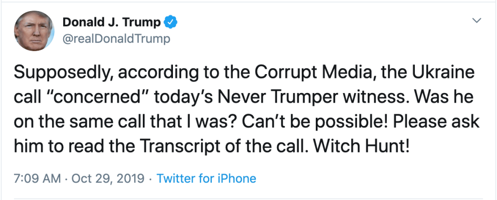 The President insists that every administration witness who testifies that he did, indeed, want a quid pro quo from Ukraine is a Never Trumper (and human scum.) But Gordon Sondland, Trump’s ambassador to the EU, donated a million dollars to Trump’s presidential campaign. He’s been a reluctant witness, modifying his memory and admitting that he did indeed tell a Ukrainian official that if they wanted their military aid, they needed to make a public statement that they’d be investigating Burisma (the company Hunter Biden was involved with) after the testimony of other witnesses put him in danger of potential perjury charges. Republicans can’t “Never Trumper” their way around this one.